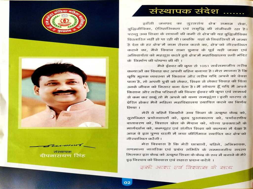 With a resolve to spread this basic need of a disciplined life as enshrined in the Vedas and religious texts among the brave women of the country, a college was established in the name of socialist thinker Dr. Ram Manohar Lohia in the Ghoshnan area of ??Bundelkhand. The foundation stone of the college was laid in the year 2010 in Gursarai town of Garautha tehsil of this extremely backward region of Bundelkhand by the promoter of socialist ideology and pioneer of girl child education and their bright future, Shri Deep Narayan Singh Deepak Yadav ji, by performing Bhoomi Pujan on 23 March 2010.